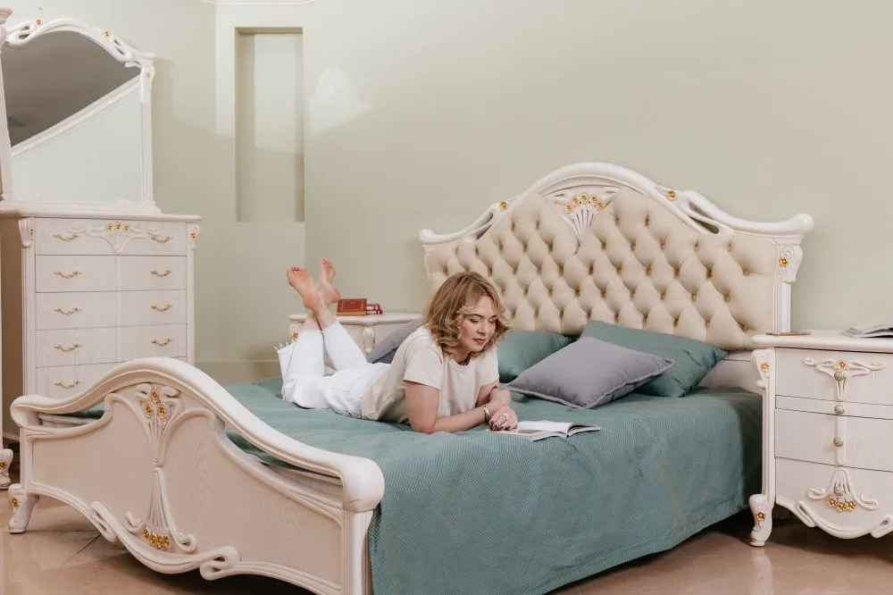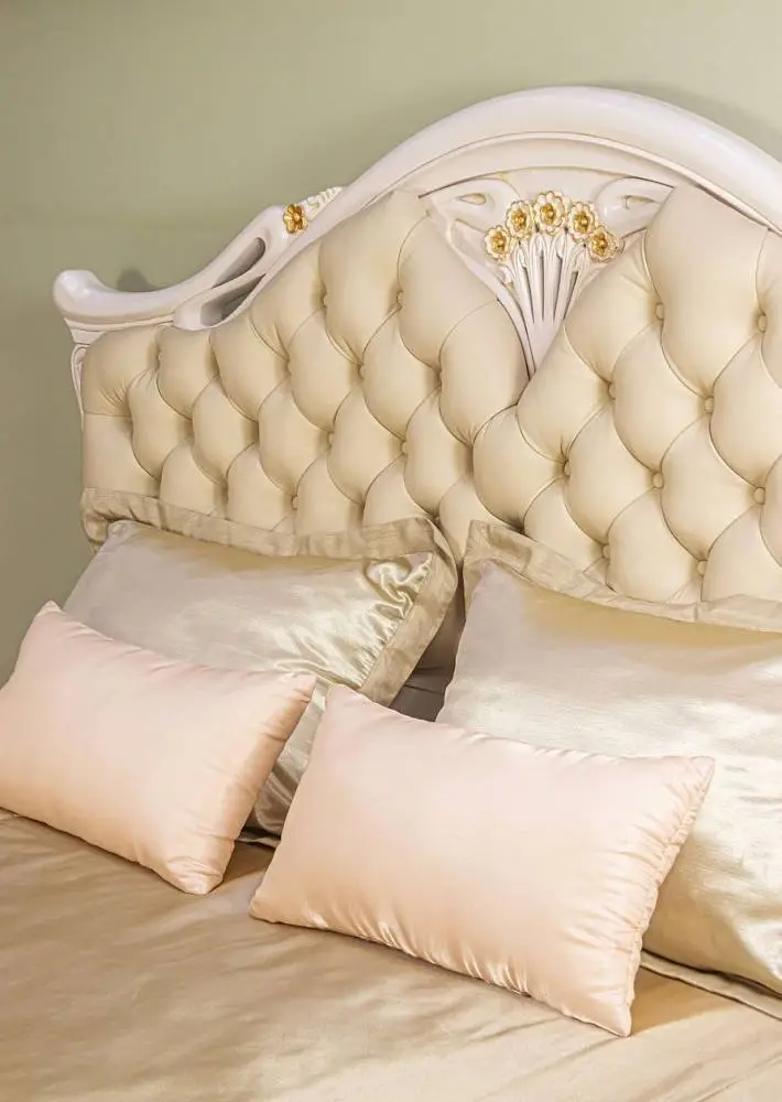 Кровать двуспальная Amelia выполнена в классическом стиле из массива северной березы в шпоне ясеня, покрыта эмалью с нанесением патины. Изголовье декорировано натуральной кожей с каретной стяжкой. Царги из бруса толщиной 30 мм. Усиленное ортопедическое основание с ламелями по технологии 70/30. Глубокий и густой цвет, массивная и элегантная форма, сложная натуральная и экологически чистая мебель Amelia разрабатывалась Миланским дизайн бюро. Вся мебель коллекции выполнена из массива северной березы, в том числе скрытые элементы. Мебель из натурального дерева не выделяет вредных веществ и имеет долгий срок службы. Каждая деталь изделия вырезана вручную, а патина из натурального серебра и изящные линии придают изделиям особенно элегантный и роскошный вид. Дизайн мебели коллекции Amelia исполняется по строгим итальянским технологиям. Разнообразие мебели поможет обустроить любые квадратные метры: гостиную, кухню столовую, кабинет, спальню.