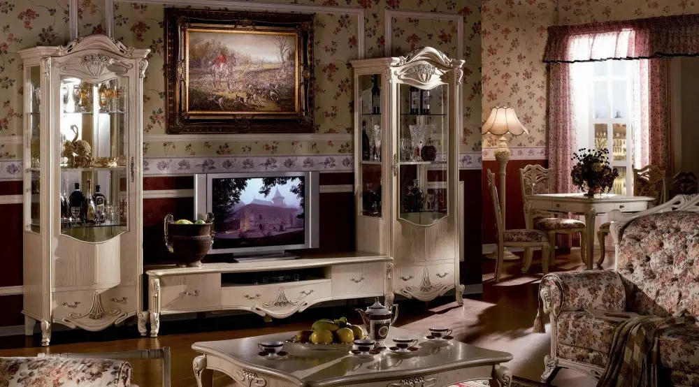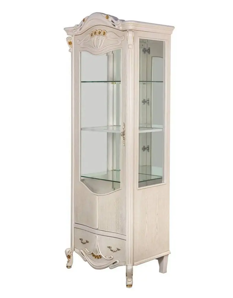 Витрина Amelia выполнена в классическом стиле из массива северной березы в шпоне ясеня, покрыта эмалью с нанесением патины.