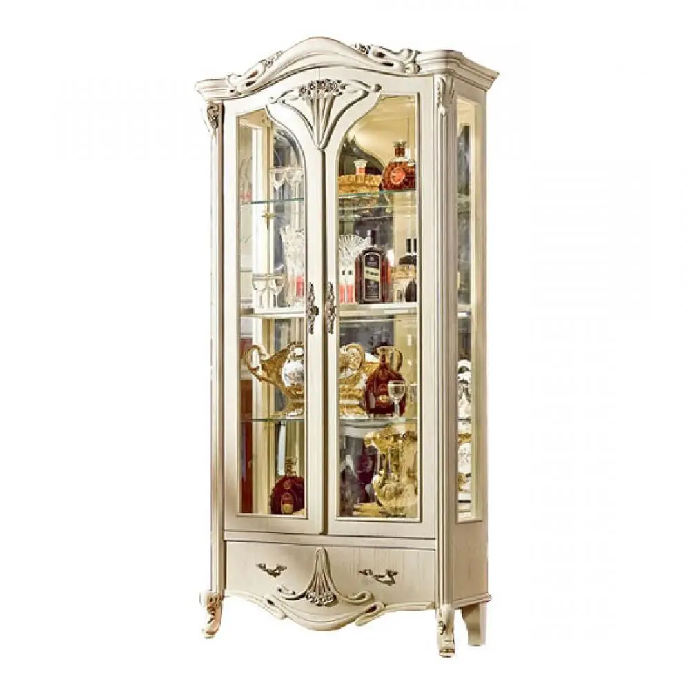 Стеклянные полки витрины обрамлены деревянной рамкой. Витрина имеет подсветку, зеркальную заднюю стенку, вариант лицевой фурнитуры в оттенке золоченное серебро. Глубокий и густой цвет, массивная и элегантная форма, сложная натуральная и экологически чистая мебель Amelia разрабатывалась Миланским дизайн бюро. Вся мебель коллекции выполнена из массива северной березы, в том числе скрытые элементы. Мебель из натурального дерева не выделяет вредных веществ и имеет долгий срок службы. Каждая деталь изделия вырезана вручную, а патина из натурального серебра и изящные линии придают изделиям особенно элегантный и роскошный вид. Дизайн мебели коллекции Amelia исполняется по строгим итальянским технологиям. Разнообразие мебели поможет обустроить любые квадратные метры: гостиную, кухню столовую, кабинет, спальню.