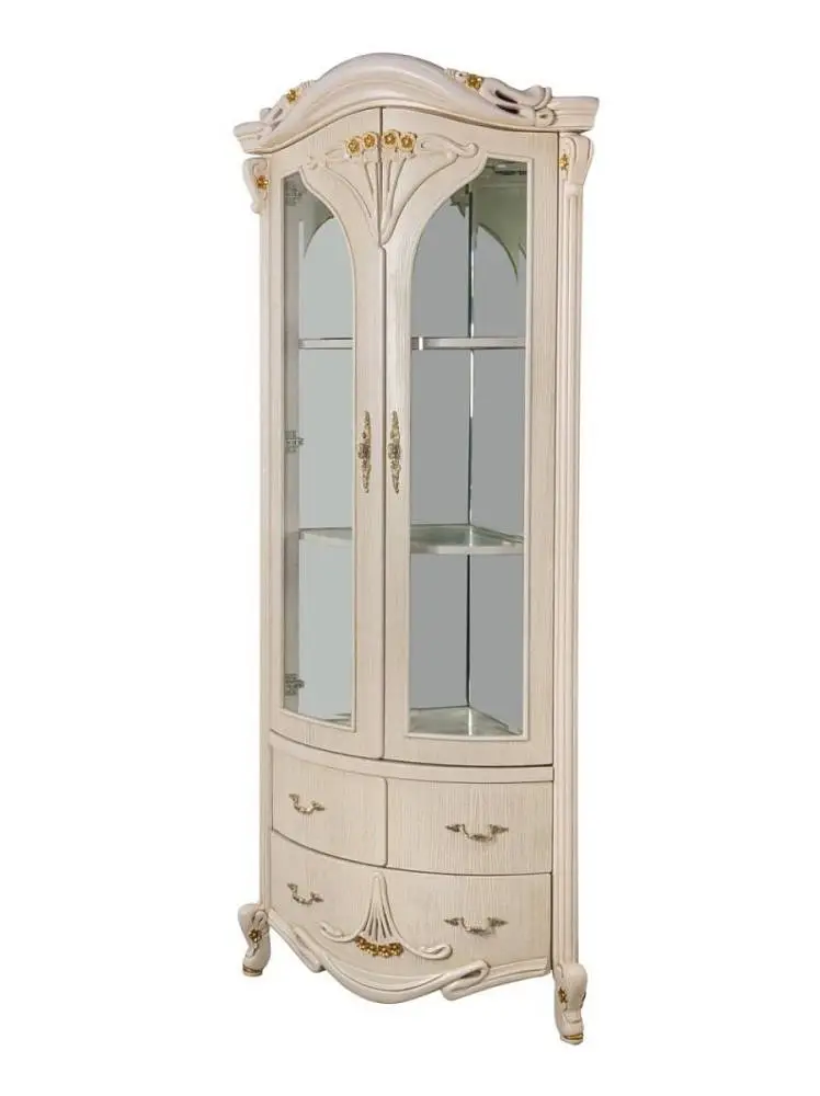 Витрина угловая Amelia выполнена в классическом стиле из массива северной березы в шпоне ясеня, покрыта эмалью с нанесением патины. Витрина идеально впишется в угловое пространство, заполняя его по максимуму. Витрина имеет вместительные ящики, дно продублировано красным бархатом, лицевая фурнитура в оттенке золоченное серебро. Глубокий и густой цвет, массивная и элегантная форма, сложная натуральная и экологически чистая мебель Amelia разрабатывалась Миланским дизайн бюро. Вся мебель коллекции выполнена из массива северной березы, в том числе скрытые элементы. Мебель из натурального дерева не выделяет вредных веществ и имеет долгий срок службы. Каждая деталь изделия вырезана вручную, а патина из натурального серебра и изящные линии придают изделиям особенно элегантный и роскошный вид. Дизайн мебели коллекции Amelia исполняется по строгим итальянским технологиям. Разнообразие мебели поможет обустроить любые квадратные метры: гостиную, кухню столовую, кабинет, спальню.