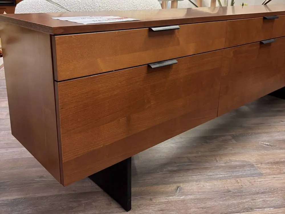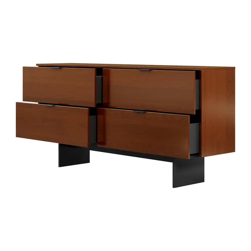 Комод ASPARO в оттенках бренди, пломбир и венге с черными акцентами станет отличным дополнением к современному интерьеру и стилю лофт. Фасады, шпонированные ценными породами дерева, сохраняют текстуру натурального материала. Прямолинейные опоры и черная фурнитура создают строгий и лаконичный образ. Внутренние направляющие скрытого монтажа с доводчиком обеспечивают плавное и бесшумное закрывание ящиков. Четыре просторных ящика идеально подойдут для хранения офисных и кабинетных принадлежностей. Также комод можно использовать как ТВ-тумбу или буфет для хранения посуды.