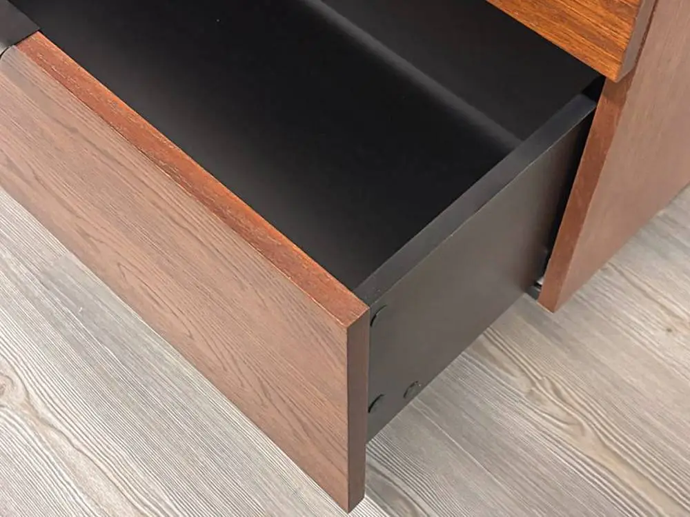 Комод ASPARO в оттенках бренди, пломбир и венге с черными акцентами станет отличным дополнением к современному интерьеру и стилю лофт. Фасады, шпонированные ценными породами дерева, сохраняют текстуру натурального материала. Прямолинейные опоры и черная фурнитура создают строгий и лаконичный образ. Внутренние направляющие скрытого монтажа с доводчиком обеспечивают плавное и бесшумное закрывание ящиков. Четыре просторных ящика идеально подойдут для хранения офисных и кабинетных принадлежностей. Также комод можно использовать как ТВ-тумбу или буфет для хранения посуды.