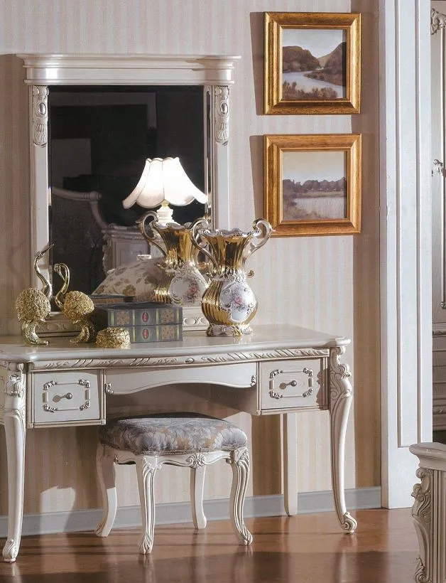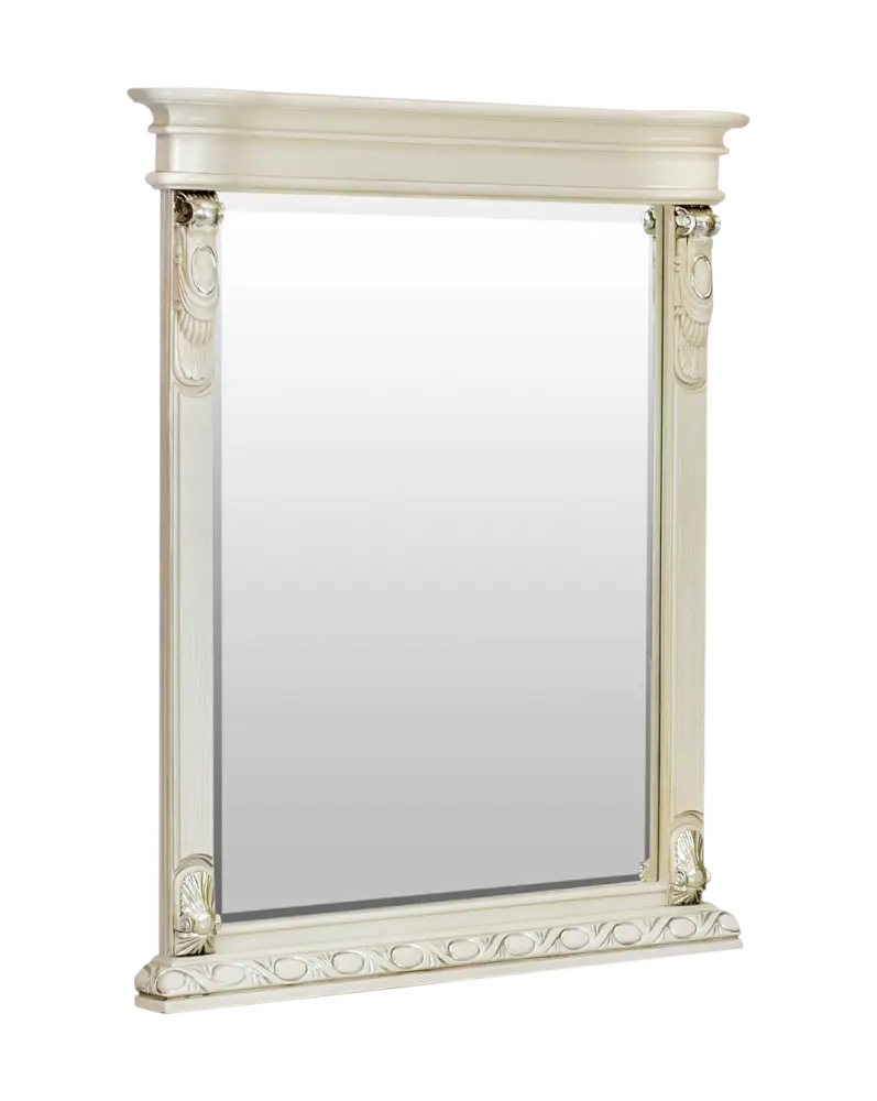 Зеркало к туалетному столику Margaret создаст роскошную и романтичную атмосферу дворцовой Франции, станет украшением интерьера, наполнив его уютом и роскошью. Зеркала выполнены из массива северной березы в шпоне ясеня, покрыты эмалью, патиной. Зеркало выполнено без эффекта искажения отражения. Оклад из резного массива, колоны из березы, по периметру обработано по технологии шлифования. Широкий фацет подчеркивает классический стиль. Вся мебель коллекции выполнена из массива северной березы, в том числе скрытые элементы. Мебель из натурального дерева не выделяет вредных веществ и имеет долгий срок службы. Каждая деталь изделия вырезана вручную, а патина из натурального серебра и нежные изящные линии придают изделиям особенно элегантный и роскошный вид. Дизайн зеркал коллекции Margaret исполняется в классическом стиле по строгим итальянским технологиям. Разнообразие мебели поможет обустроить любые жилые квадратные метры: гостиную, кухню столовую, кабинет, спальню.