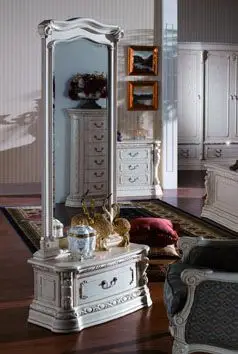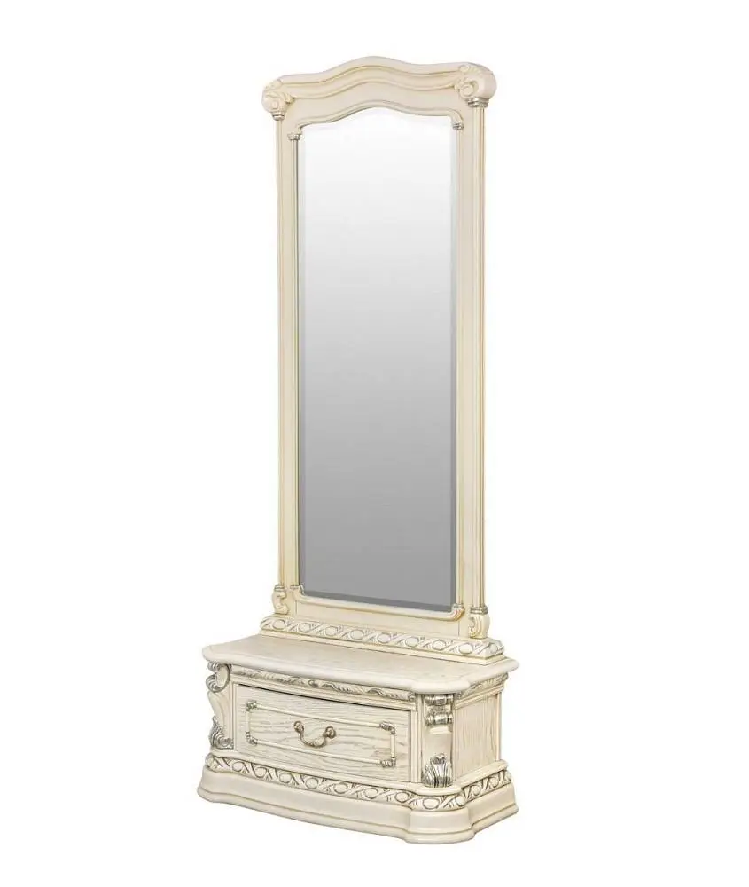 Напольное зеркало Margaret создаст роскошную и романтичную атмосферу дворцовой Франции, станет украшением интерьера, наполнив его уютом и роскошью. Зеркала выполнены из массива северной березы в шпоне ясеня, покрыты эмалью, патиной. Зеркало выполнено без эффекта искажения отражения. Напольное зеркало имеет вместительный ящик, дно обито красным бархатом, который дает эффект устойчивости предметам, находящимся внутри. Вся мебель коллекции выполнена из массива северной березы, в том числе скрытые элементы. Мебель из натурального дерева не выделяет вредных веществ и имеет долгий срок службы. Каждая деталь изделия вырезана вручную, а патина из натурального серебра и нежные изящные линии придают изделиям особенно элегантный и роскошный вид. Дизайн зеркал коллекции Margaret исполняется в классическом стиле по строгим итальянским технологиям. Разнообразие мебели поможет обустроить любые жилые квадратные метры: гостиную, кухню столовую, кабинет, спальню.